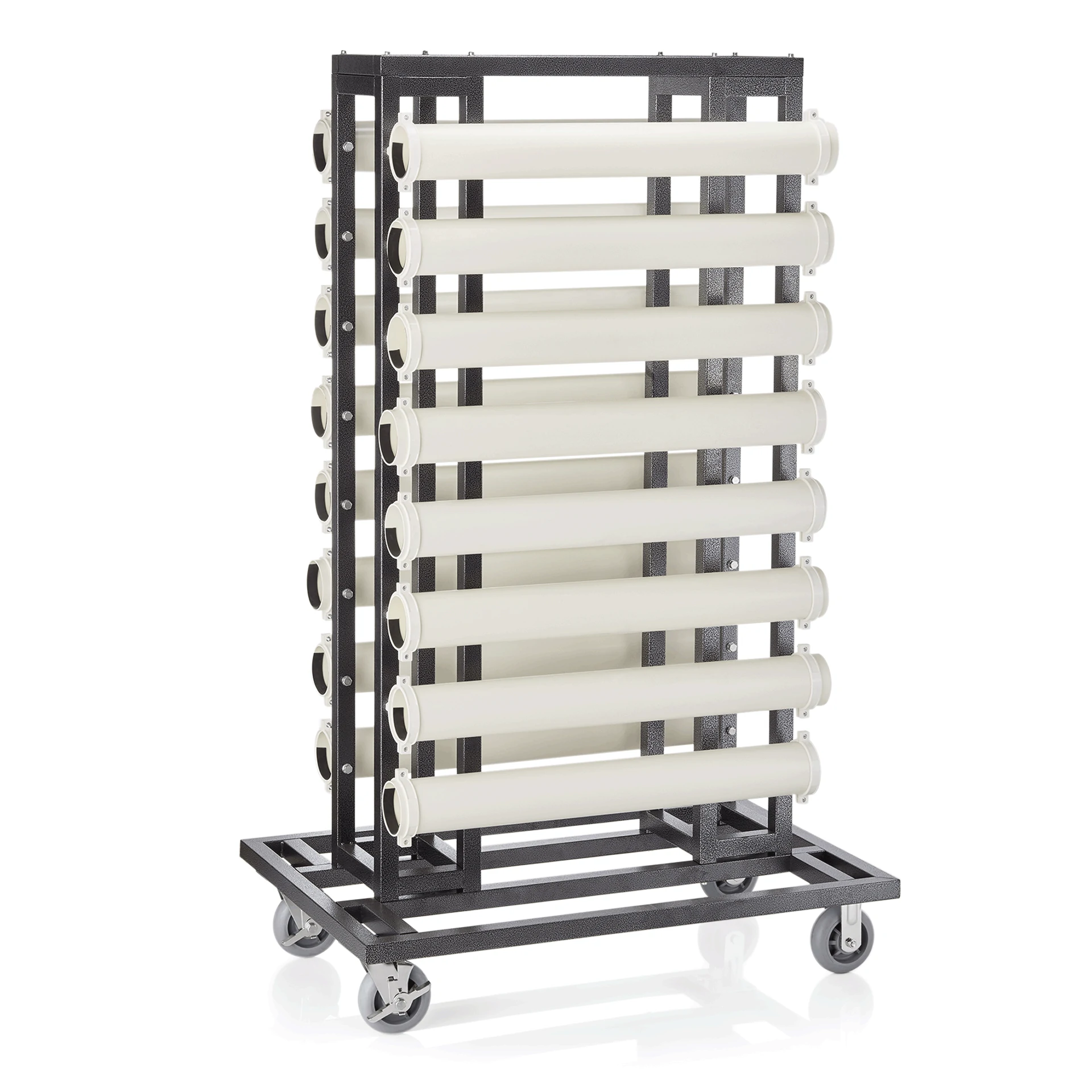 The product is powder-coated and designed for barrier posts with a diameter of up to 10 cm. It features two swivel castors with brakes and two fixed castors, making it suitable for accommodating up to 16 barrier posts and approximately 20 ropes. The posts are securely placed in PVC tubes, each with a diameter of 10 cm.