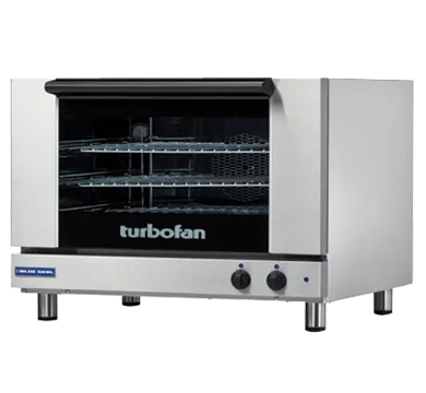 The Turbofan Convection Oven is an electric, countertop appliance with an assembled height of 27-7/8 inches. It has the capacity to hold three full-size sheet pans with a tray spacing of 3-1/3 inches. The oven features manual controls and a mechanical thermostat with a range of 150 to 500 degrees Fahrenheit. It includes a 60-minute timer for precise cooking.