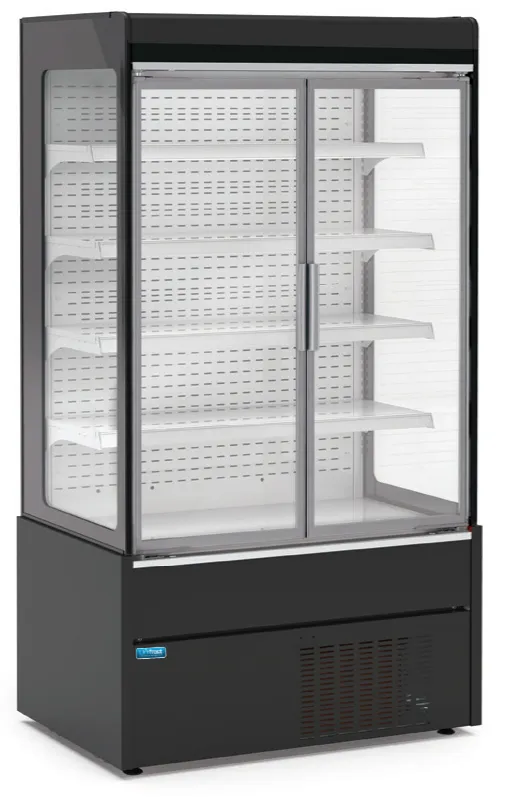 The contemporary two-door energy-saving multideck merchandise display cooler features an attractive modern exterior with subtle sophistication. Its interior is designed to showcase a wide variety of products, ranging from food to cold drinks, making it ideal for convenience stores, supermarkets, petrol stations, catering outlets, and off-licenses. This cooler offers significant savings on energy costs.