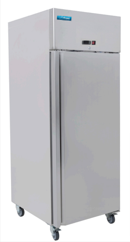 The large larder refrigerator cabinet is designed to accommodate GN2/1 containers. It features precision high-density polyurethane insulation, which provides excellent thermal efficiency and contributes to low running costs. The cabinet is equipped with mobile swivel castors, allowing it to pass through any standard doorway, making installation convenient in any location. Additionally, the off-cycle defrost management system includes a dual device to expedite the defrosting process.