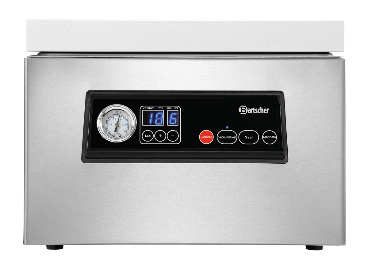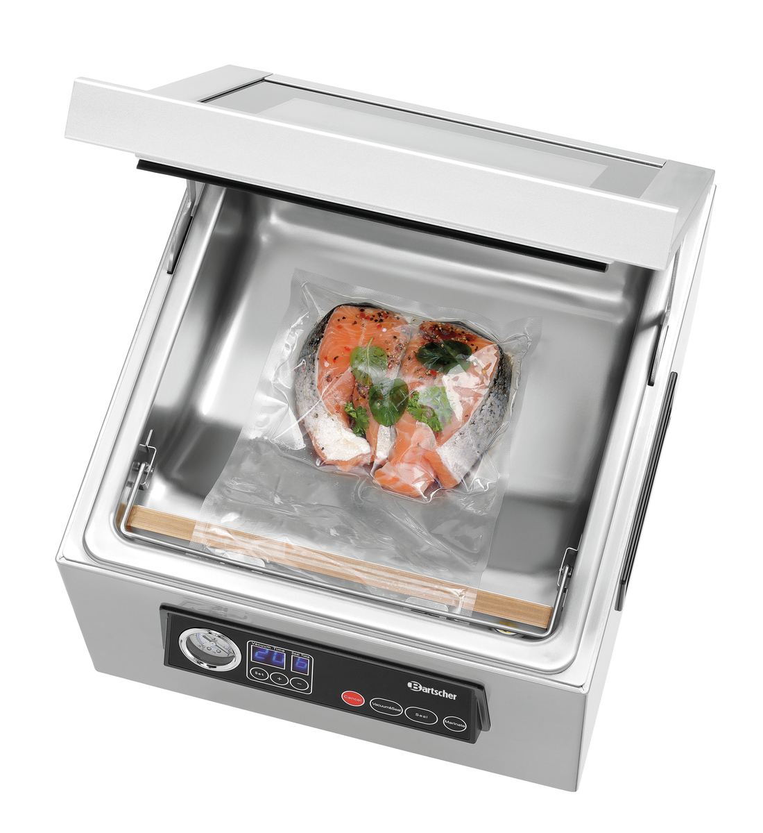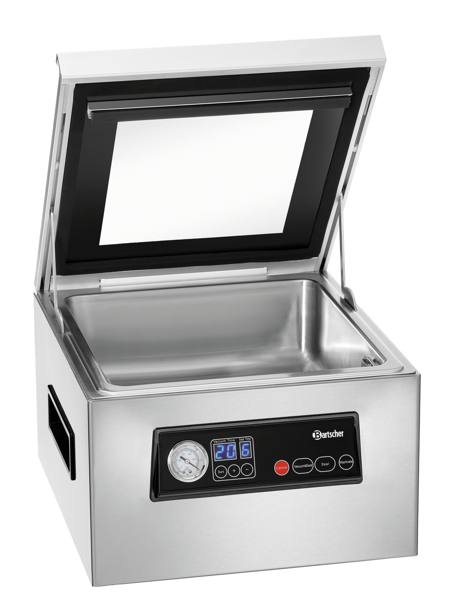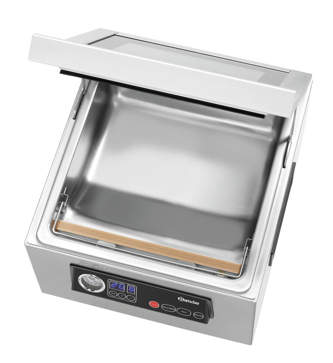 The chamber vacuum packaging machine is designed to keep everything under control. It is equipped with a glass lid and a manometer for monitoring underpressure. Additionally, a clamp bar in the chamber ensures that the vacuuming bag remains securely in place and does not slip during the process.