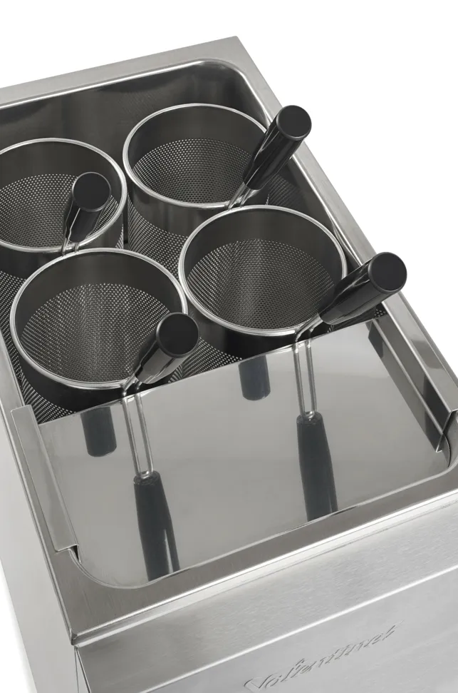 The Multi Cooker is an essential tool for caterers looking to expand their menu options. Its design accommodates a combination of standard gastronorm containers and baskets, allowing for versatile menu offerings. Constructed from stainless steel, this compact unit features a one-piece pressed pan that is fully insulated. A rear tap unit, connected to the water supply, facilitates easy filling and aids in the removal of starch when cooking pasta. Additionally, the unit can be connected to the waste water system via the back.