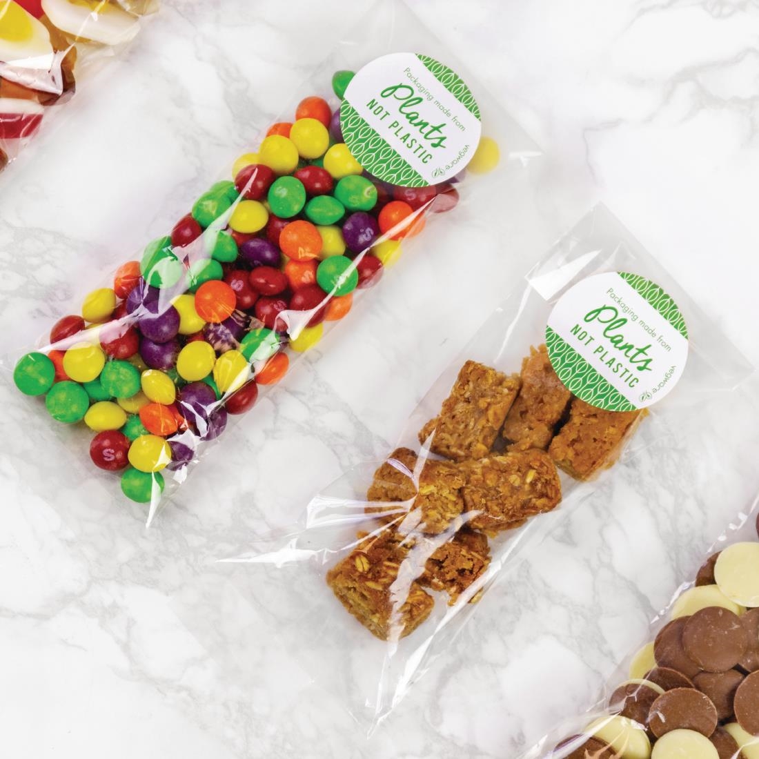 Serve small treats with a sustainable touch using this pack of 1000 clear Vegware compostable NatureFlex bags. Made entirely from the renewable, wood pulp-based NatureFlex material, these bags can be commercially and home composted along with food waste after use. This process diverts waste away from landfill and instead turns your packaging into nutrient-rich compost used to grow plants.