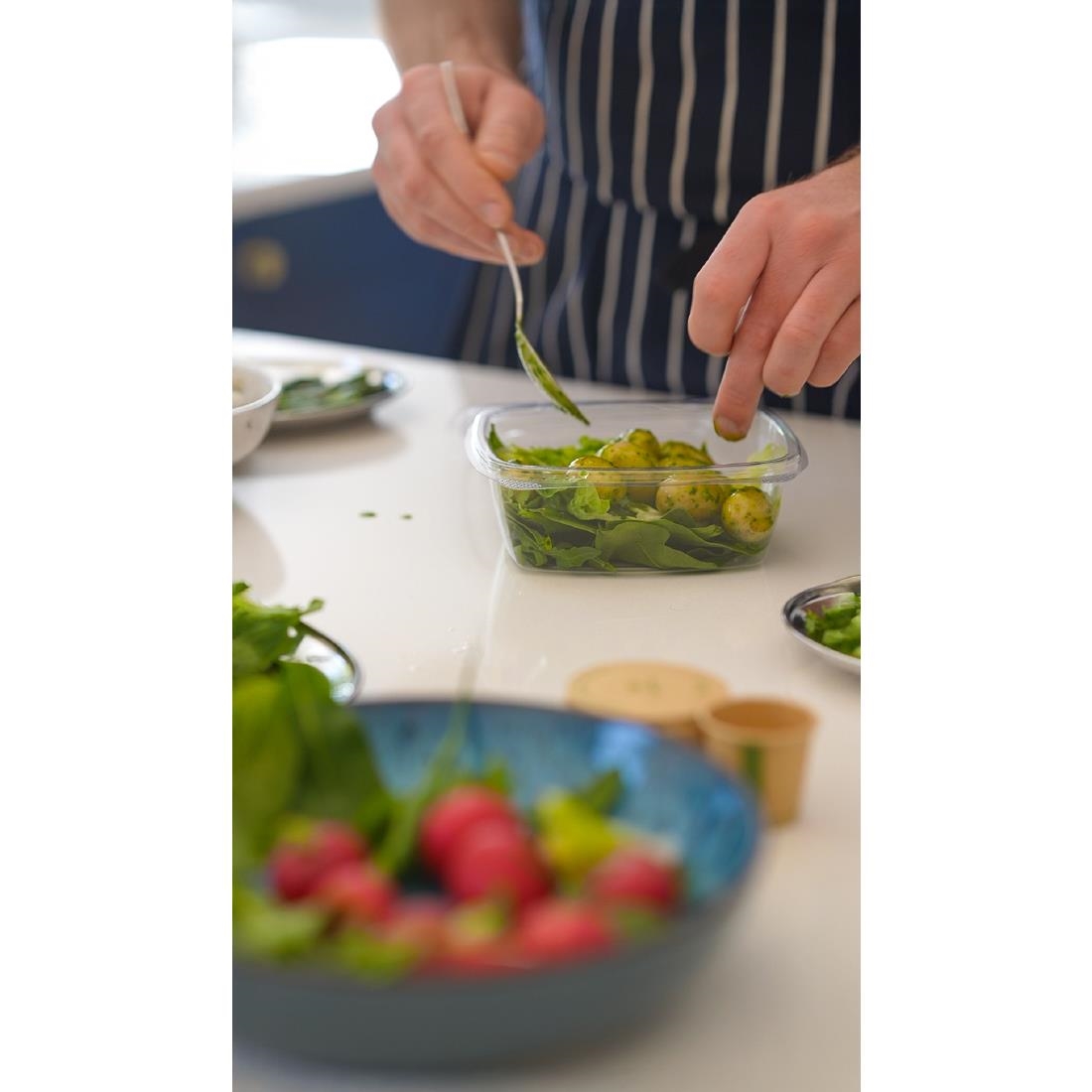 The PLA material offers excellent clarity, ensuring the vibrant colours in your salads really stand out and impress customers. The hinged lid creates a tight seal to prevent leaks and keep food fresh for longer. A sturdy design protects contents when on display, and the PLA material is suitable for serving food up to 45deg C.