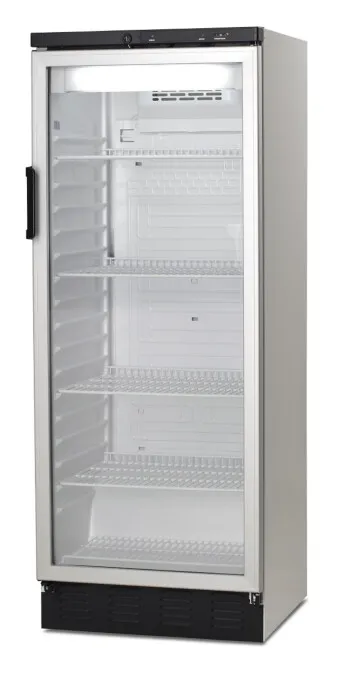The FKG311 is a compact multi-use upright display cooler with a gross capacity of 306 liters (10.9 cu.ft). It is capable of storing 378 x 330ml cans or 189 x 500ml bottles, making it suitable for hygienically storing food items as well. The cooler features automatic defrosting and adjustable wire shelves. Additionally, a larger model, the FKG 371, is also available.