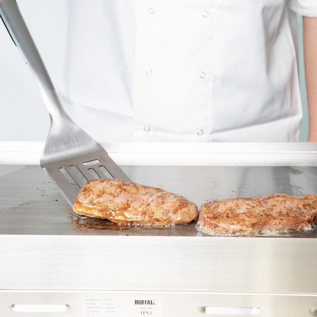 The Vogue BBQ spatula is a durable and practical solution for lifting, turning and serving meat, vegetables or seafood on a BBQ. With its extended handle and serrated edge, the Vogue spatula also allows you to cut foods directly on the grill and then lift or rotate them as required.