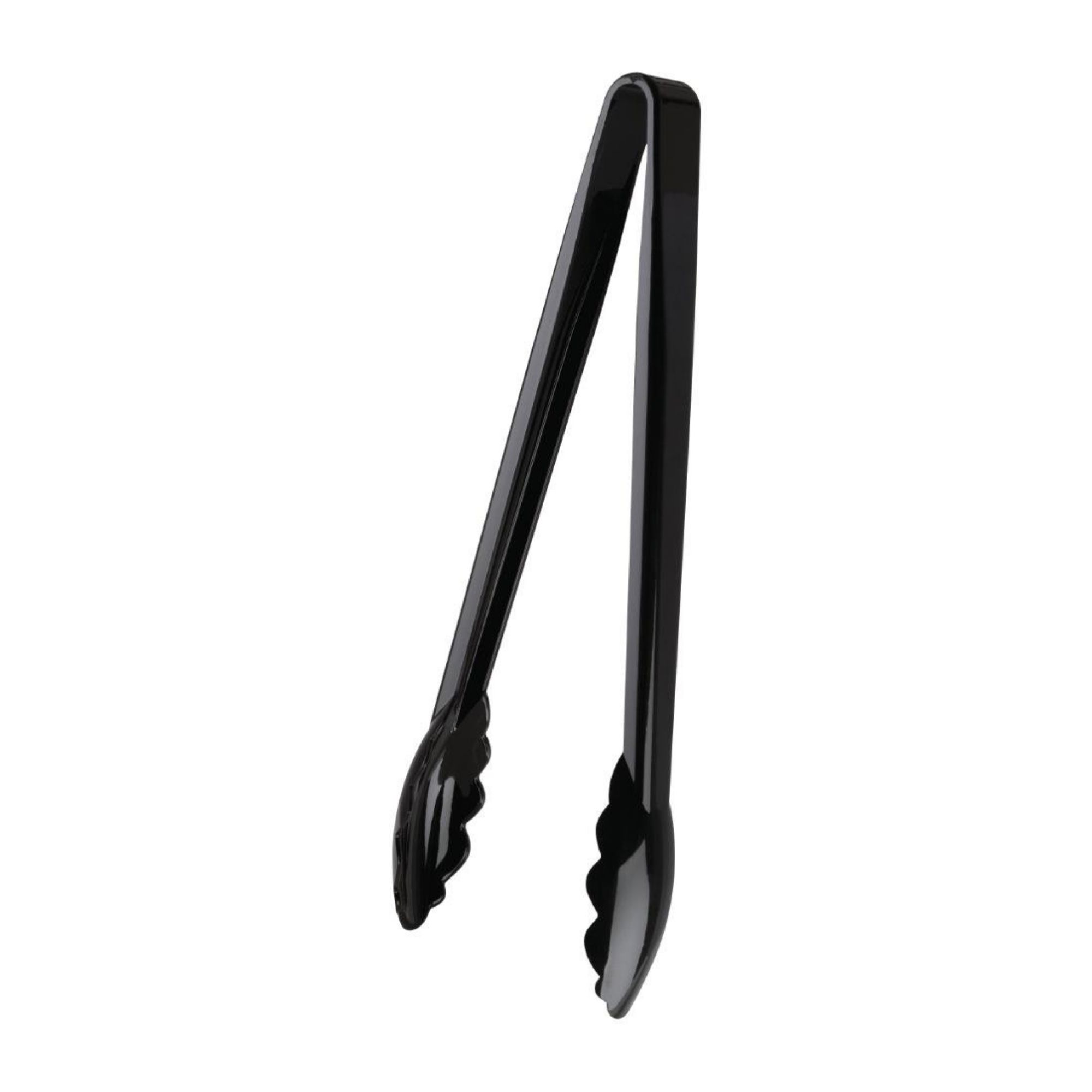 These black plastic tongs are a versatile and essential tool for any kitchen or catering event. Designed for durability and ease of use, they provide a firm grip for serving a variety of foods, from salads to pastries. The sleek black finish adds a touch of elegance, making them suitable for both casual and formal occasions. Lightweight yet sturdy, these tongs are easy to handle and clean, ensuring they remain a reliable utensil in your culinary arsenal.