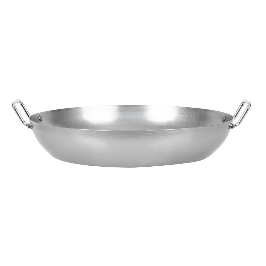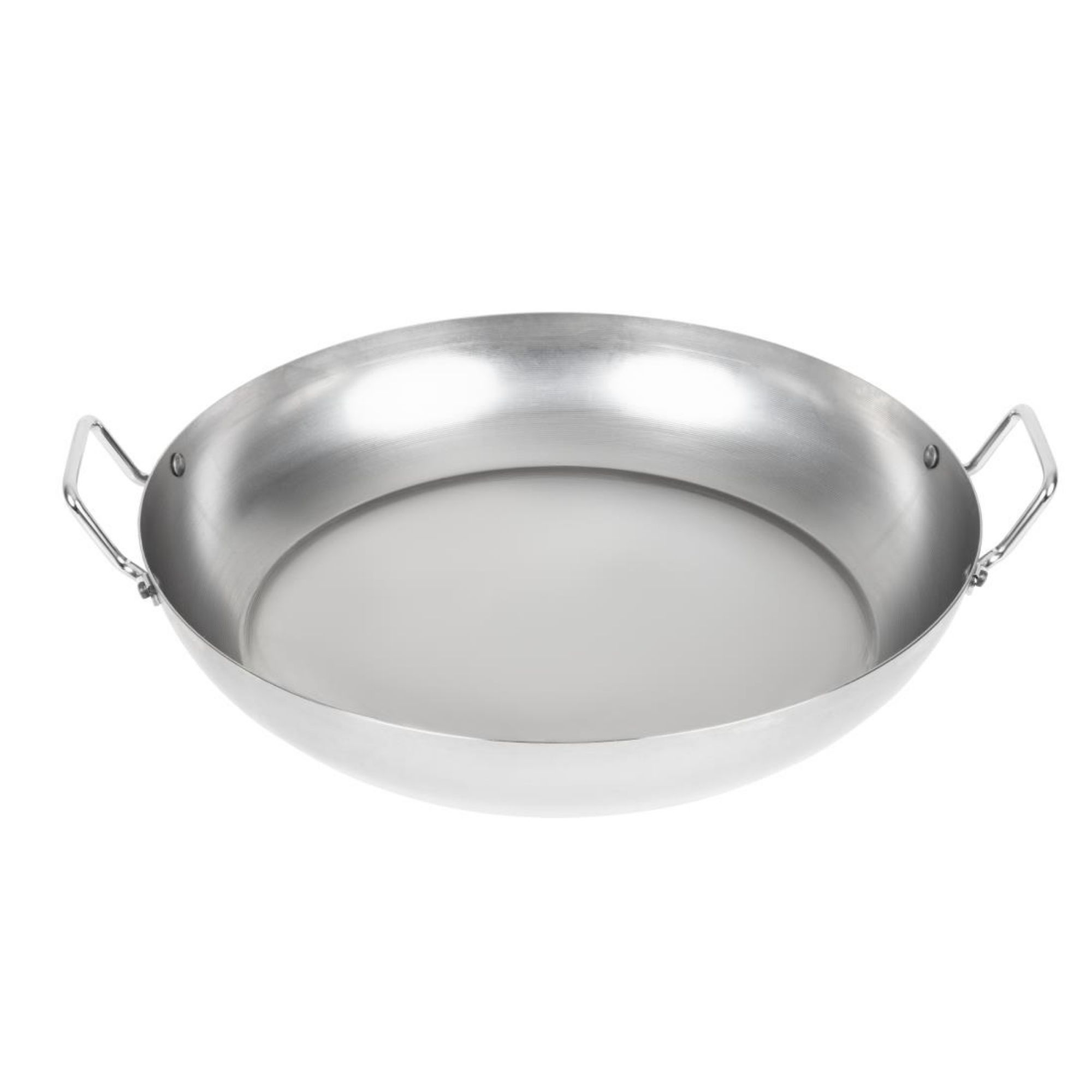 Carbon steel is a perfect material for paella as it absorbs heat slowly and retains it over a long period of time. The heat is distributed evenly, creating the perfect dish. Pans must be seasoned before first use.