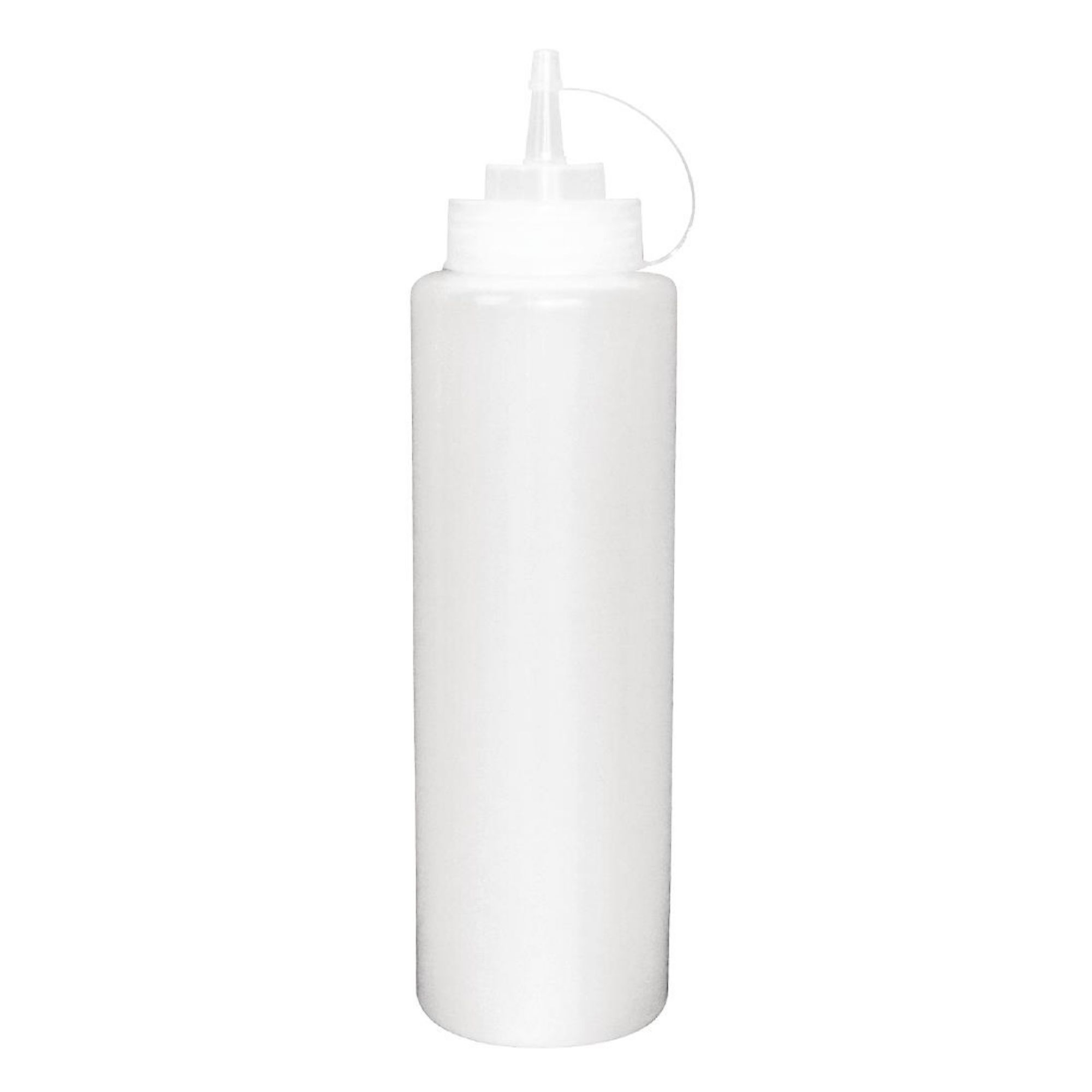 The product is made from flexible, soft polyethylene and features a screw top with a wide neck for easy refilling. It is designed for sauce dispensing or decorating purposes. Please note that the nozzles must be trimmed for general sauce dispensing.