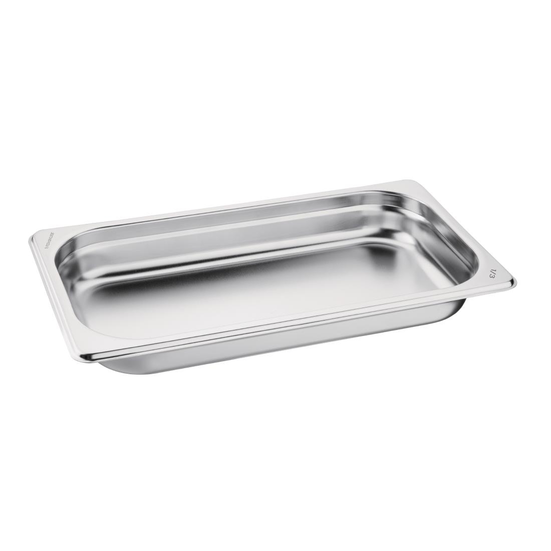 Prepare, cook, and store your food with this Vogue stainless steel 1/3 GN pan (40mm/1.45Ltr). Featuring an overhanging rim, this pan is particularly useful for slotting into a buffet station or preparation unit for quick and easy access to foods. Constructed from stainless steel, the pan resists warping and shattering, enabling it to withstand years of commercial kitchen usage, which saves you money on buying replacements. The corners are also particularly strong to avoid damage from knocks and weight. The stainless steel is a stylish alternative to plastic and looks great on a front-of-house buffet station. This is a top-quality pan from professional catering brand Vogue.