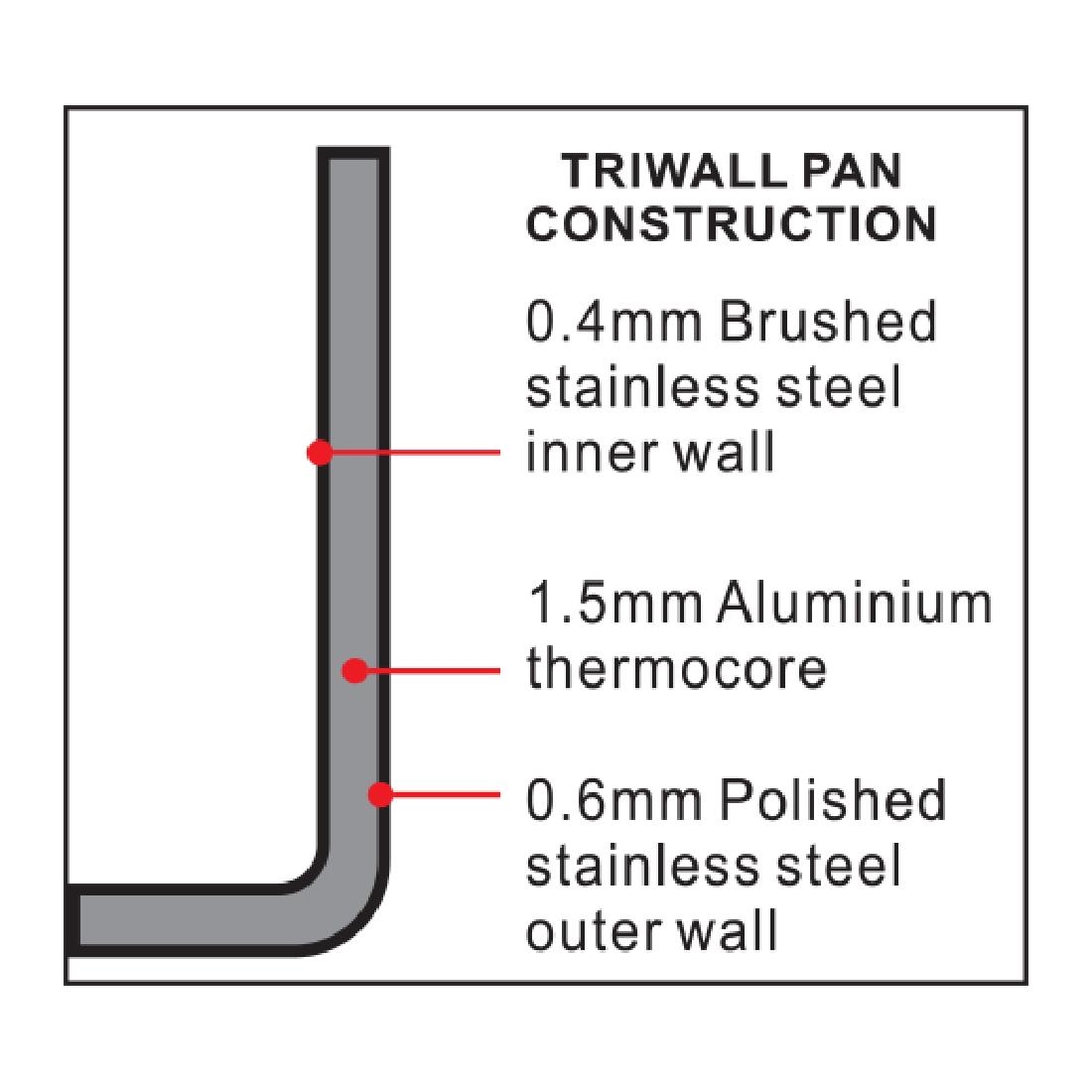 Miniature pan made from aluminium thermocore sandwiched between stainless steel. Provides even heat distribution without hotspots. Suitable for use with all cooking surfaces, except induction.