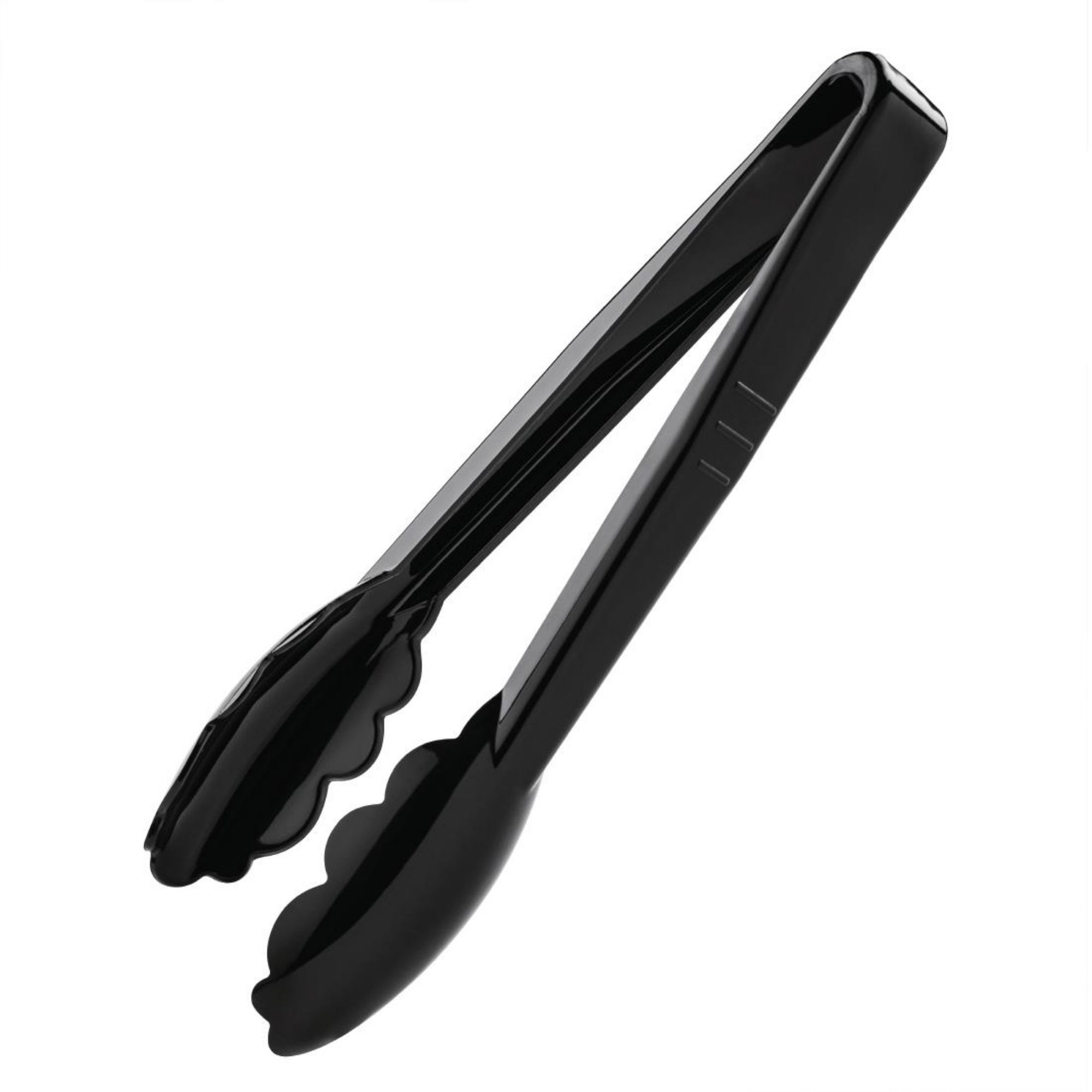 These black plastic tongs are a versatile and essential tool for any kitchen or catering event. Designed for durability and ease of use, they provide a secure grip for handling a variety of foods. The sleek black finish adds a professional touch, making them suitable for both casual and formal occasions. Lightweight yet sturdy, these tongs are perfect for serving salads, pasta, and other dishes, ensuring convenience and efficiency in food preparation and presentation.