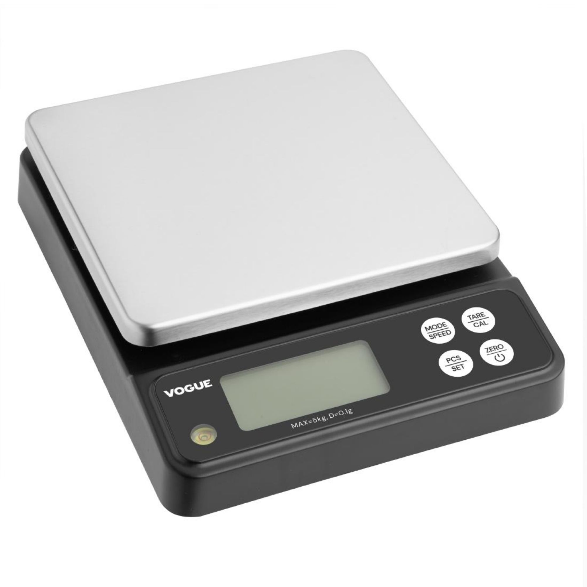 Easy to use and easy to clean, the Vogue electronic scale is designed to save you valuable time without compromising on accuracy. With a weighing capacity of 5kg at 0.1g graduations, the Vogue scales are highly accurate, allowing you to weigh larger quantities with precision. Switching between kg and lb is simple too, and readings are provided on a large and easy-to-read backlit digital display.