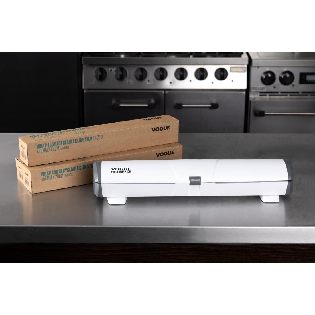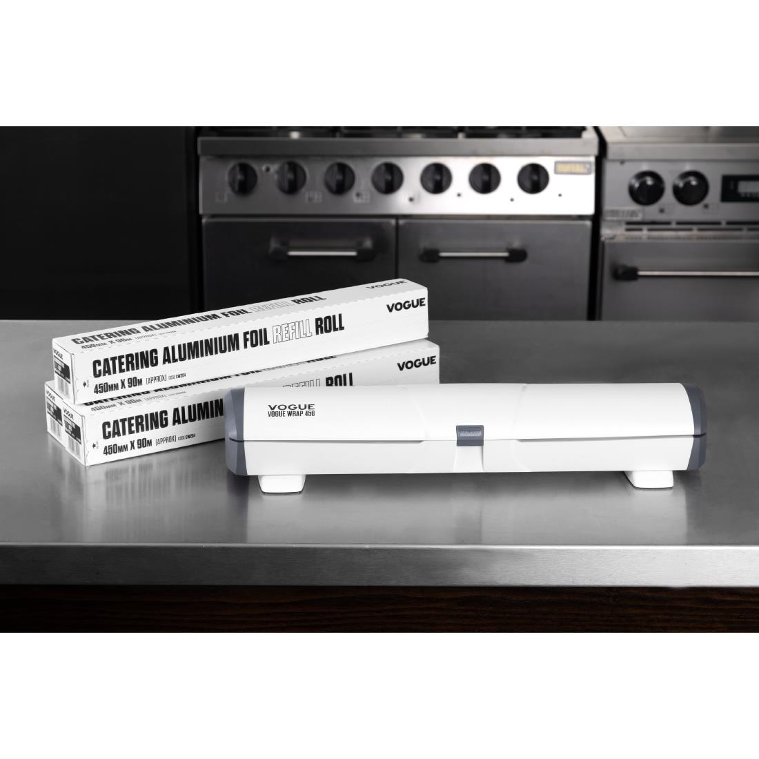 The dispenser is compatible with all Vogue Wrap 450 refills, including Eco Cling, Standard Cling Film, Foil, and Parchment.