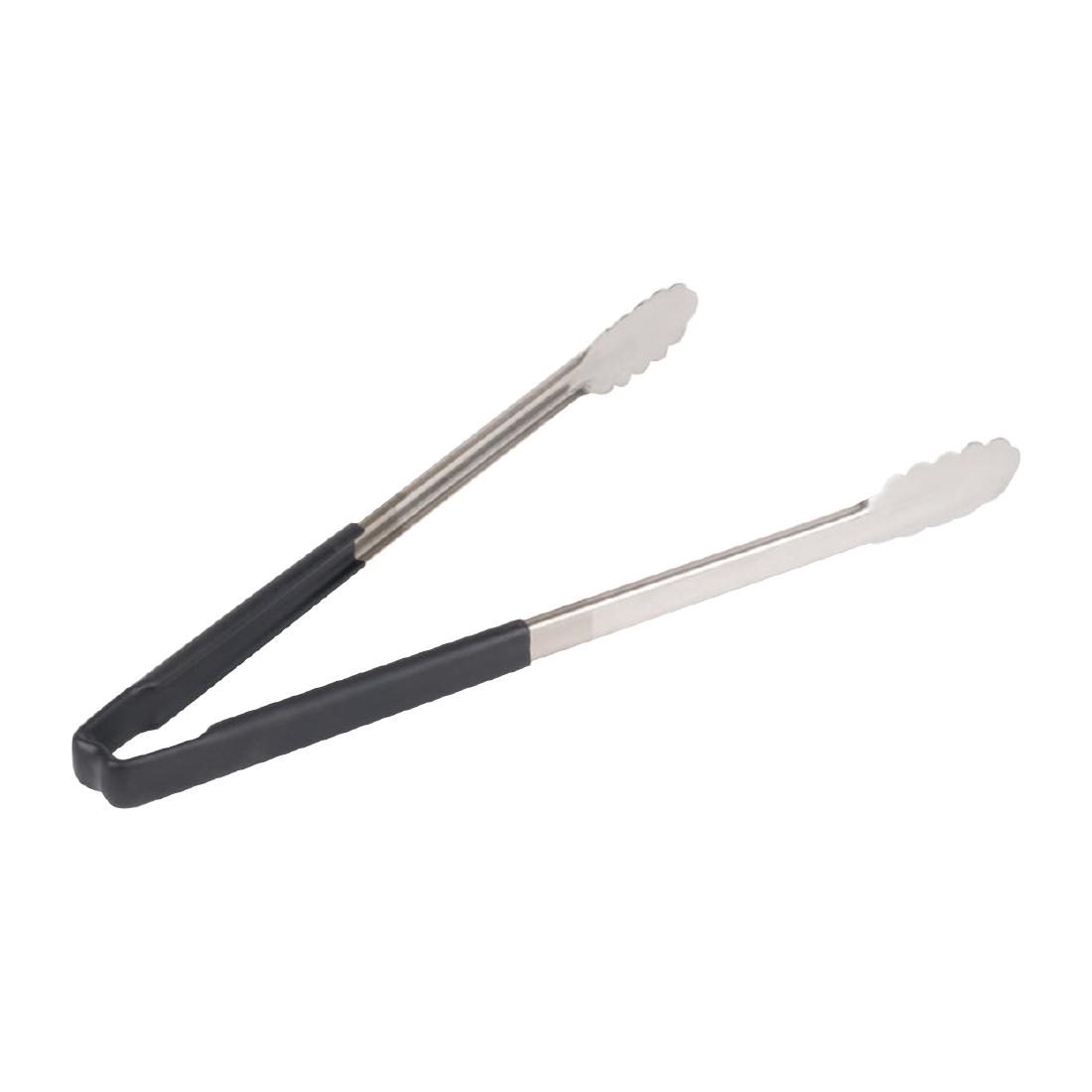 Offering impressive durability, efficiency and versatility, the black Vollrath one-piece scalloped tongs are perfect for cooking and serving. Made of strong stainless steel, these tongs are fully functional up to 176deg C and are sure to provide years of superior service. The springless design eliminates food traps and ensures easy cleaning, while the scalloped ends allow for a gentle, yet firm, grip on a wide range of food items.