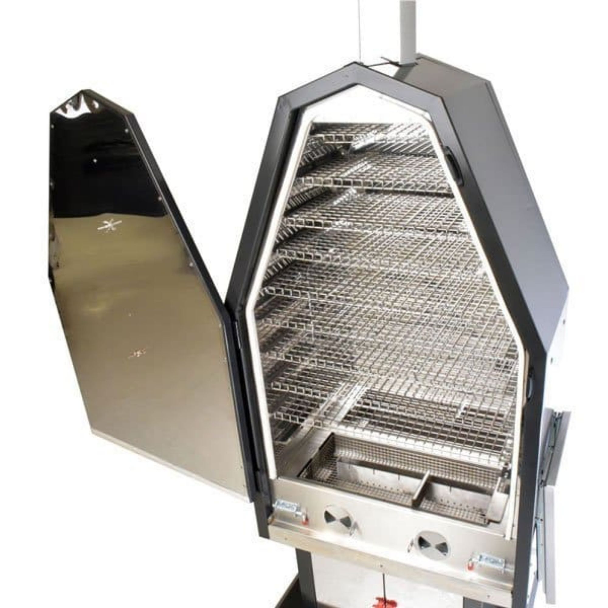 • Check icon• Twin thermometer readings: Need to check the temperature at the top and bottom of our commercial BBQ smoker? Twin thermometers built in to the smoker door will tell you all you need to know to manage your smoking.