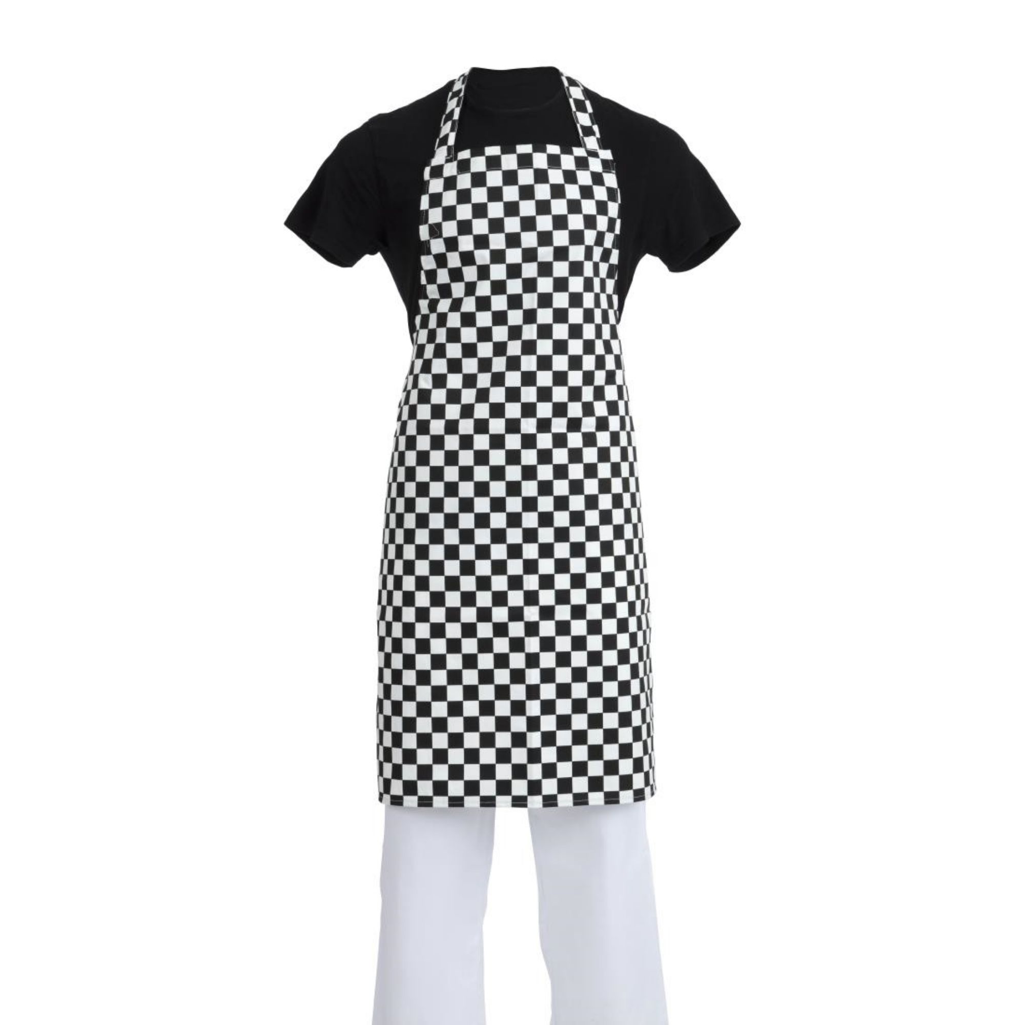 The hardwearing black and white checked polycotton bib apron is designed for durability and style. It features sewn-in ties, making it suitable for both front and back of house use.