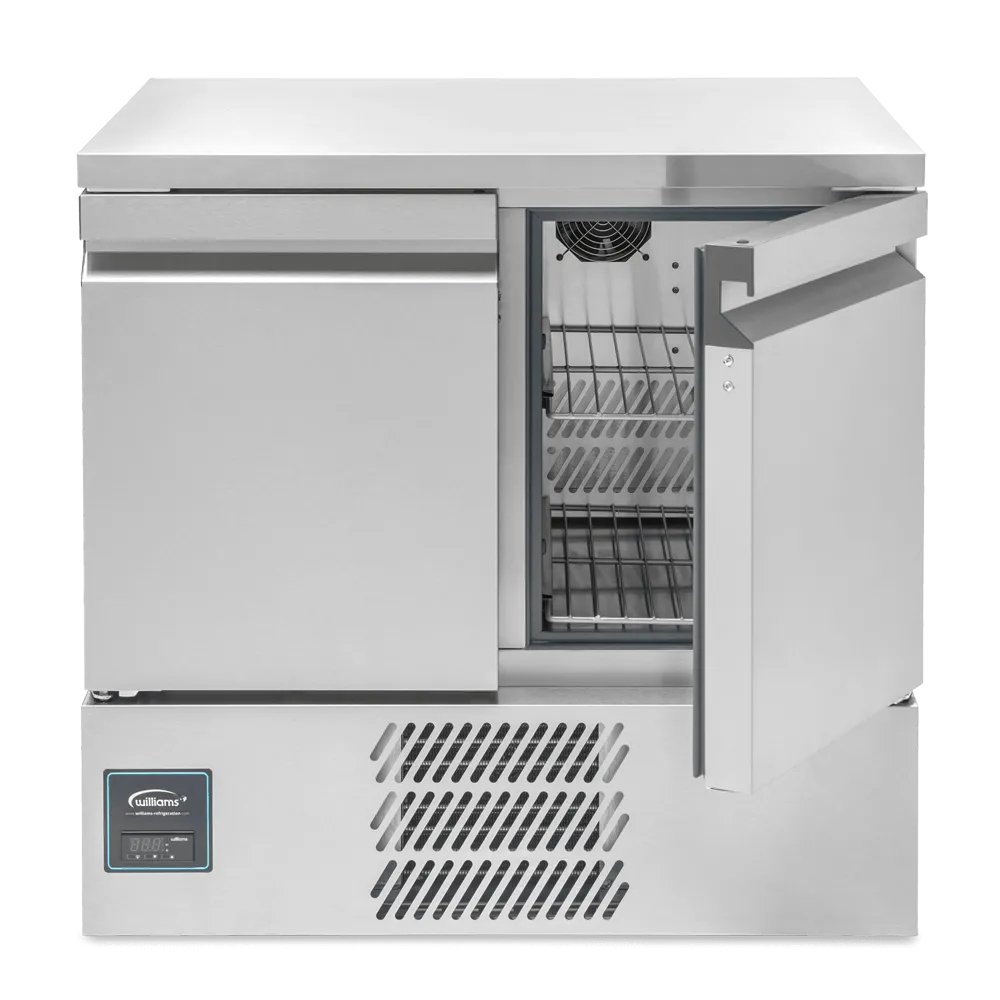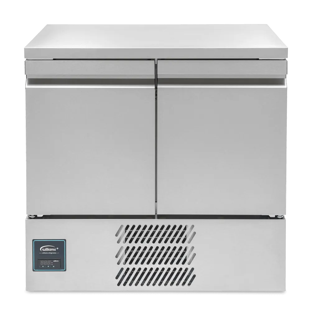 The AZ10CT commercial refrigerator is a two-door, front-vented storage counter designed to hold four GN 1/1 trays. It offers a generous capacity of eight cubic feet and features an integral stainless steel countertop. With a width of 885mm, it serves as an ideal storage solution for areas where space is limited.