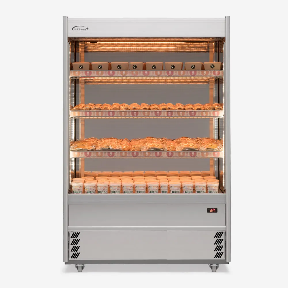 Food is displayed on the three tilted shelves and the interior base, each of which has its own individually controlled temperature setting. This feature allows you to set the temperature to match the requirements of different food types. Like all Williams Multidecks, the Scarlet is designed to deliver an attractive display that will help maximize your grab-and-go merchandising sales. The bright interior features polished foodsafe stainless steel shelves and full-length LED lighting. The optional panoramic glass ends offer increased visibility, allowing customers to see the display from more angles.