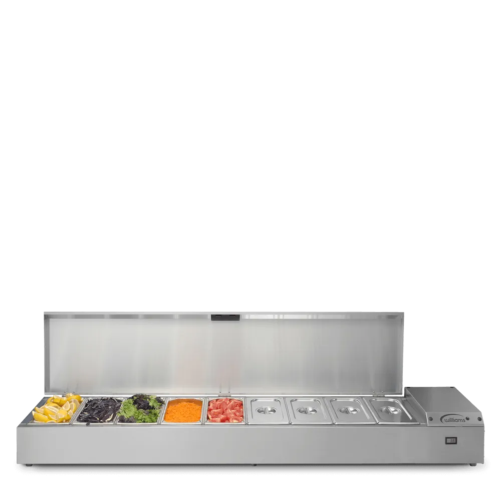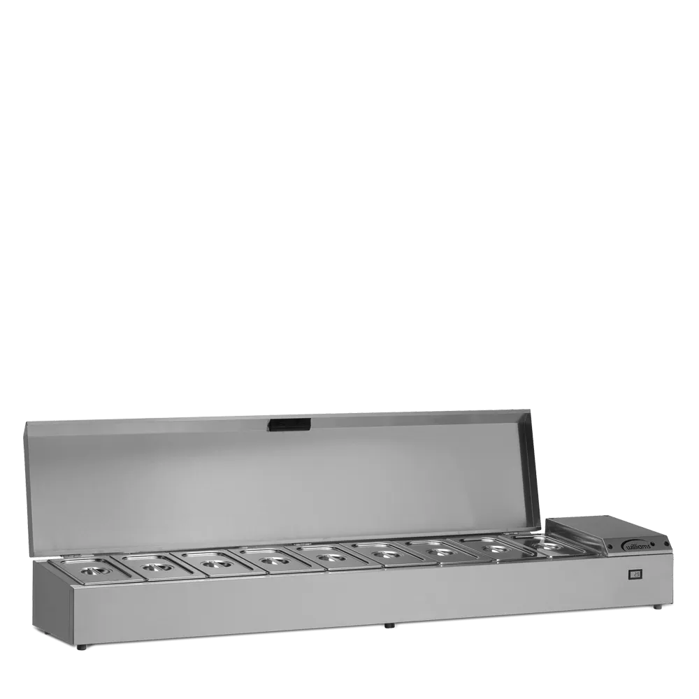 Able to hold a maximum of nine 1/3 GN pans, the TW18 is a standalone refrigerated prep well that can be configured for a variety of kitchen environments. Whether wall-mounted, sited on counters, or fitted with legs, the TW18 refrigerated thermowell is ideal for any kind of food preparation that requires fresh ingredients to be readily accessible.