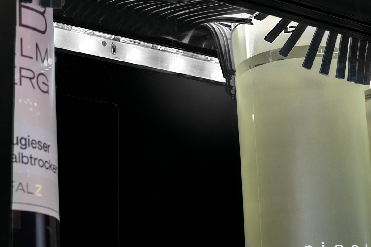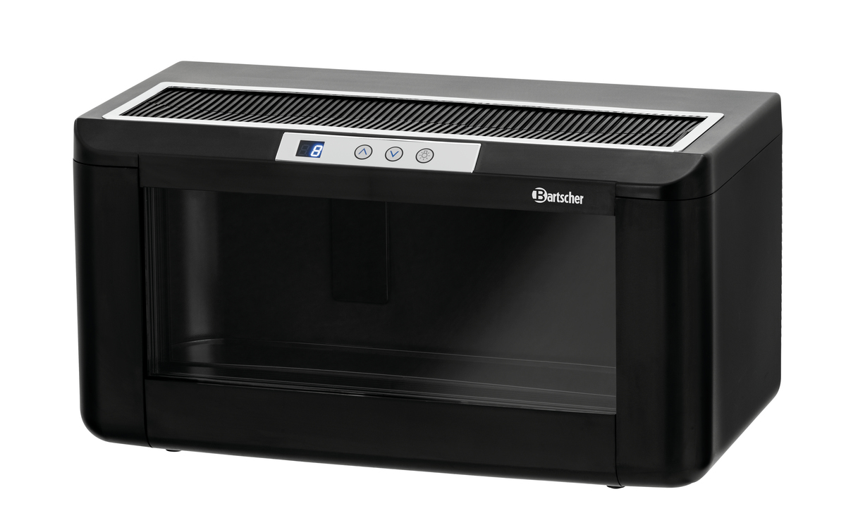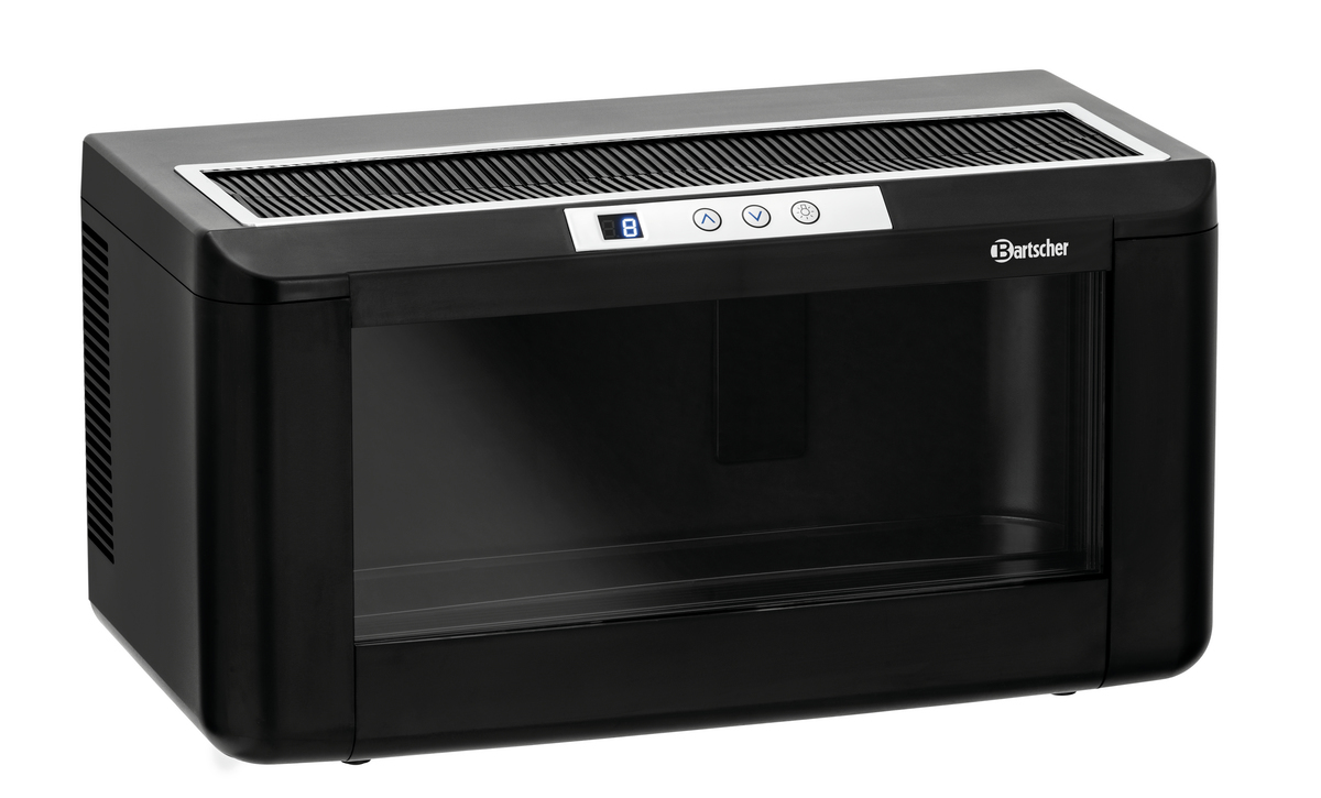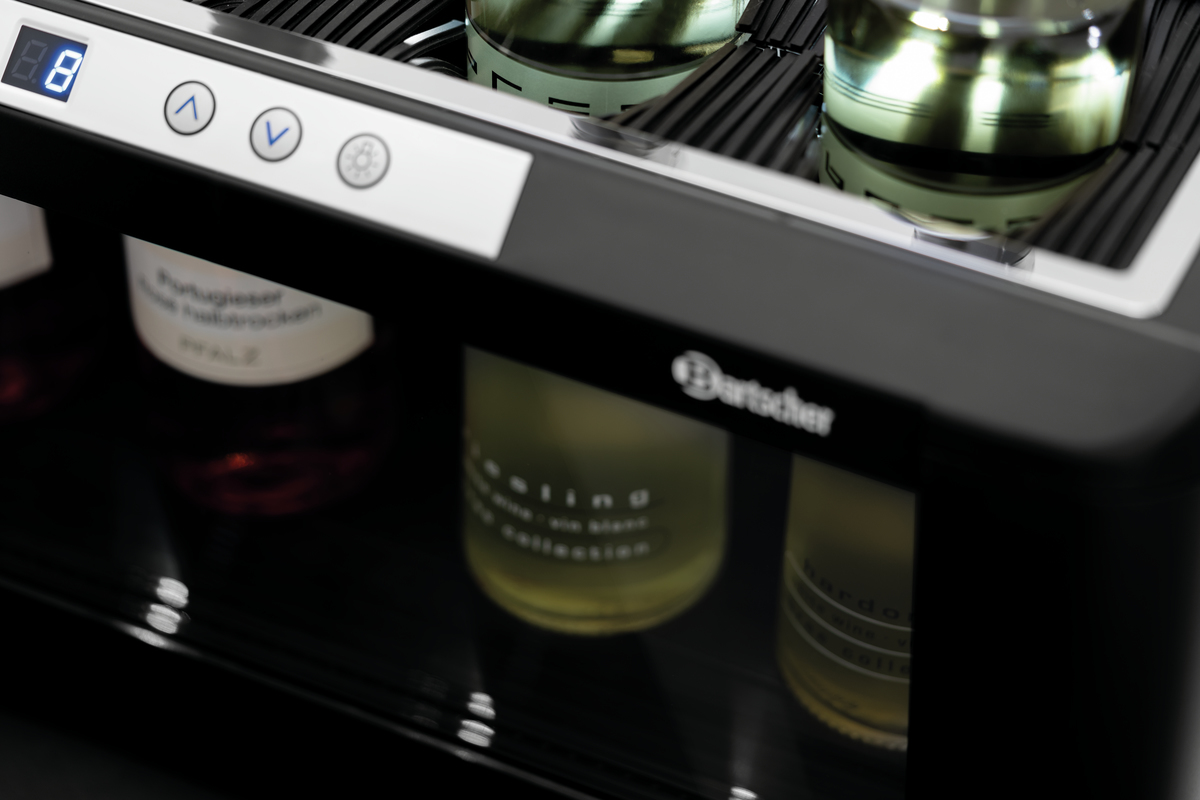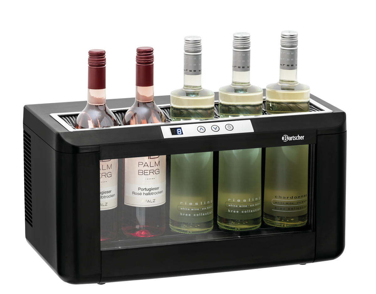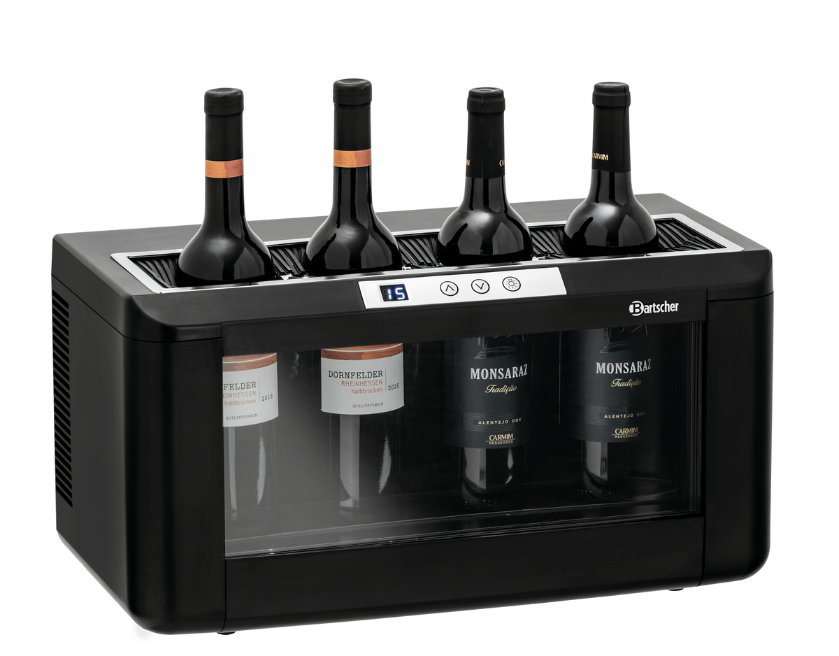 This wine cooler, featuring LED lighting, provides space for four or five bottles of wine. It accommodates even sparkling wine or Bordeaux bottles, ensuring they are stored at the precise temperature. With its modern and simple design, this wine cooler is ideal for use in restaurants, bars, and buffets.